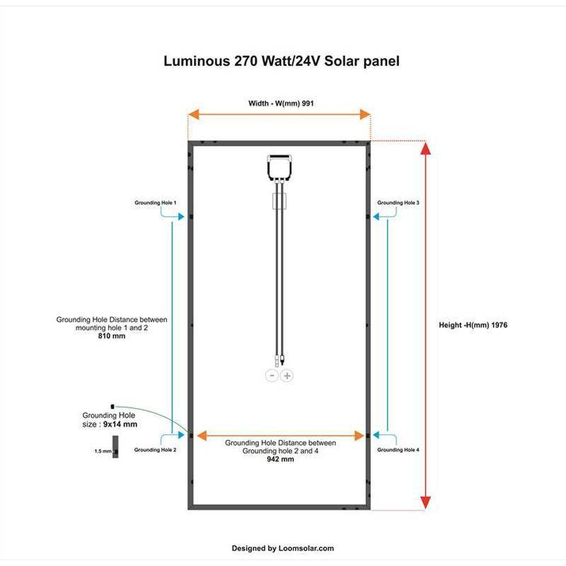 Luminous solar panel 270 Watt - 24 Volt is used to generate electricity from solar panels. It is connected with inverters for generated electricity to make use in homes and offices. since 270 watt solar panel is 24 volt, it is must that it should be connected with 24 volt (2 battery system) inverter. A single 270 watt panel generates 8.3 amps current when sun is at peak between 11 am - 3 pm.